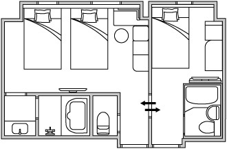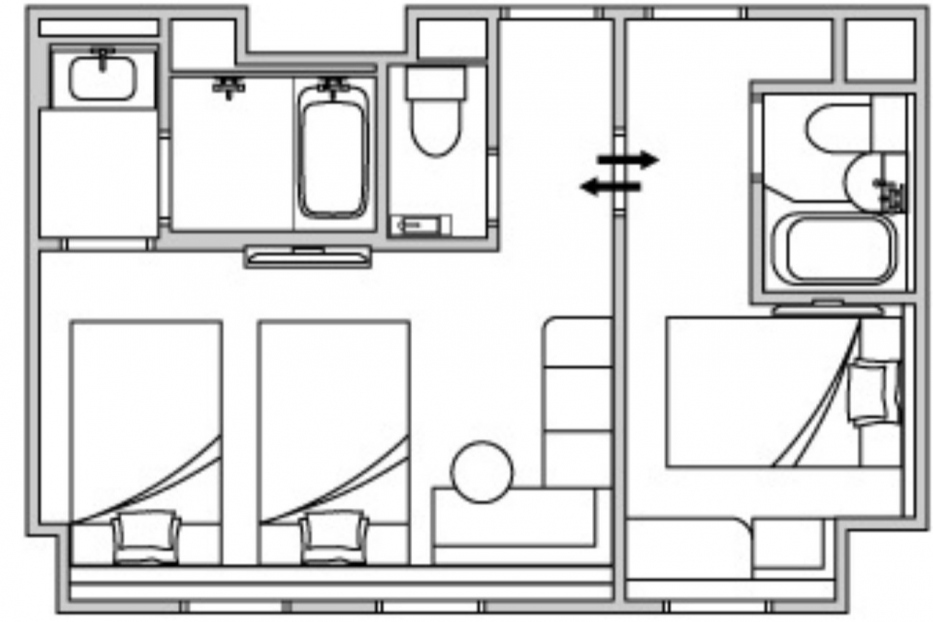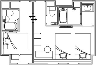 お子様連れの旅行でも安心して過ごせる設計です。それぞれのお部屋にベッドとバス・トイレが完備されており、快適にお過ごしいただけます。