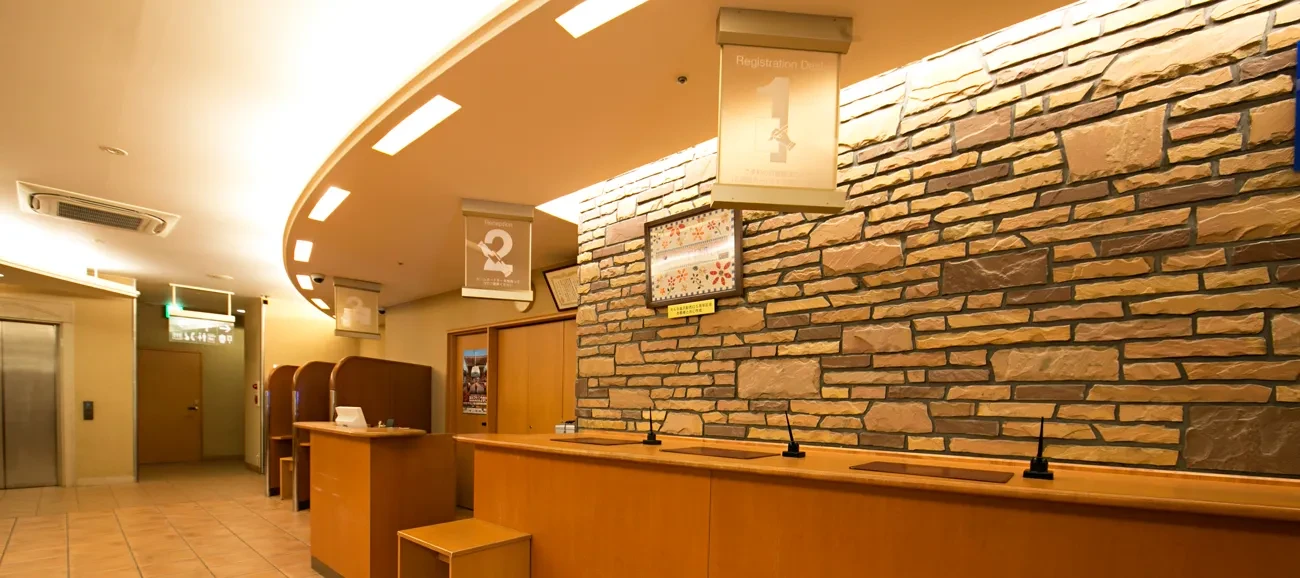 落ち着いた色調のフロントとロビー。 深夜24時以降は安全のため入口玄関を施錠いたしております。