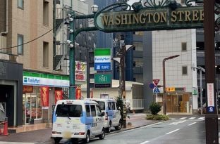 06 前方左手にワシントンR&Bホテルとファミリーマートの看板が見えてきます。