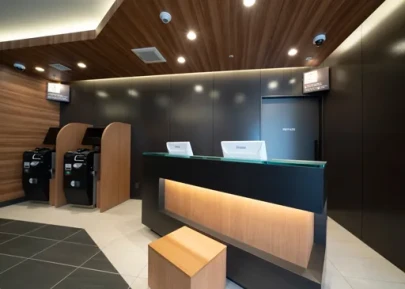 落ち着いた色調のフロントとロビー。 深夜24時以降は安全のため入口玄関を施錠いたしております。 玄関のカードリーダーにルームカードキーをかざすと解錠します。