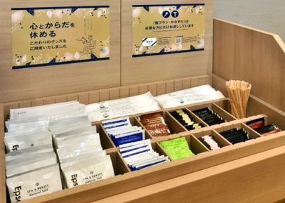 「エプソムバスソルト」や「ねむねむプラスハーブティー」、歯ブラシ、かみそり、ヘアーブラシ、スキンケア一式(DHC)、綿棒、ボディタオル、コーヒー、紅茶、緑茶などをご用意しております。